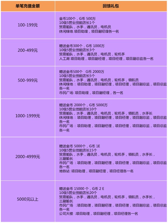 为迎接新的创业者到来,诺亚市政府颁布了鼓励创业的措施。现在只需要通过充值即可获得诺亚城最稀有珍贵的金币,还可获得金币、G币、员工等大量充值回馈。新的旅程开始了!