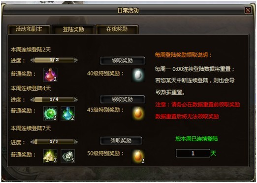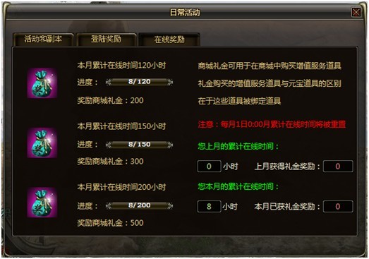 活动面板新增“登陆奖励”和“在线奖励”面板