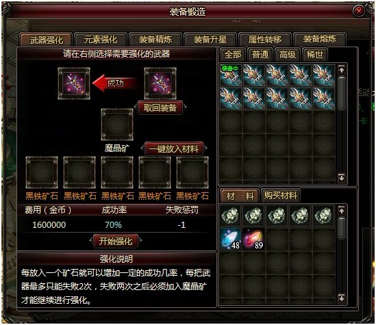 强化成功则强化等级+1,并增加伤害。强化失败则强化等级-1,降低伤害。如果使用魔晶矿,强化失败不会掉落强化等级,每次失败会增加1%的成功率。