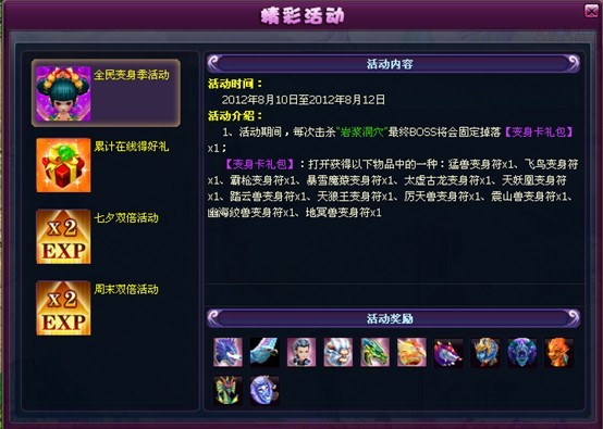 1、活动期间,每次击杀“岩浆洞穴”最终BOSS将会固定掉落“变身符礼包”*1;