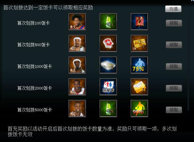 1. 首冲送大礼以获得开启后首次划拨的饭卡数量为准,奖励只可领取一项,多次划拨饭卡无效(如活动开启后首次划拨5000饭卡,则只能领取5000档的奖励)