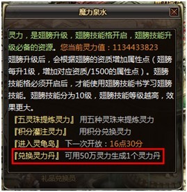 与魔力泉水NPC对话,投入五灵珠即可获得随机灵力值奖励,并且有一定几率获得翅膀技能书与信仰神水。投入的五灵珠的种类越多获得的灵力值越高,同时获得技能书与信仰神水的几率也越高。