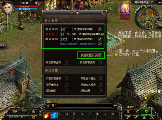 1.点击主界面下面的设置按钮即可打开设置面板,在设置面板里即可进行游戏的基本设置和战斗设置。其中战斗设置就是今天要讲的重点:如何自动加血。