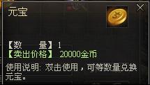 3、在游戏NPC处出售道具,可以获得对应价值的金币,直接出售元宝给NPC可以获得大量金币,一个元宝=2万金币。