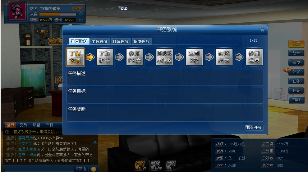 2.去掉之前版本中新手玩家在游戏中强制接任务、签球员、打比赛的过程,玩家在创建完球队后开始读条,进入游戏主界面,然后会弹出一个新手任务引导界面,玩家通过此界面,了解如何做任务,如何得到球员,如何参加选秀等等一些基础游戏。通过新手任务将以前繁琐的新手引导改成一条任务链,让玩家去逐步去了解游戏,更快的熟悉游戏操作流程。