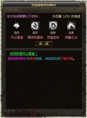 PS:超级信仰神水的材料——天山雪莲,野外小BOSS有50%的几率掉落,商城同样有售,仅售10元宝一个。