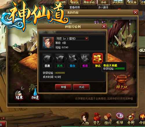 陪游神仙道药园种植有两种模式,一种是种经验树,另一种是种发财树。