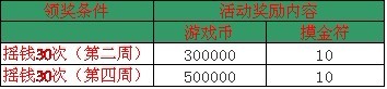 【活动内容】:活动时间内,每日摇钱满30次即可领取丰富奖励一份。