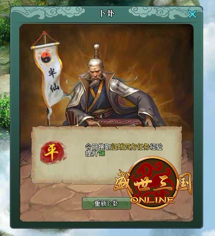 问天命积星运来陪游盛世三国免费卜卦,不用钱还可以得到游戏随机送出的礼物。在这里你每天都有机会免费得到宝贝。例如当日接取国家发展任务经验可提30%、接取征战四方任务经验可提升7%。不过如果你觉得一次玩的不过瘾,你可再次点击卜卦,不过下次就要收费了!如果你屡试不爽就根据你想卜卦的次数来算钱了。陪游盛世三国只要你来卜卦就绝对不会让你白来一趟。